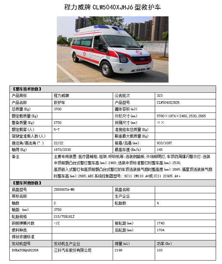 標(biāo)準(zhǔn):程力專汽作為有十余年生產(chǎn)經(jīng)驗的救護(hù)車廠家,產(chǎn)品覆蓋江鈴特順救護(hù)車、江鈴新世代V348救護(hù)車、江鈴新全順V362救護(hù)車、等各類型的江鈴救護(hù)車!