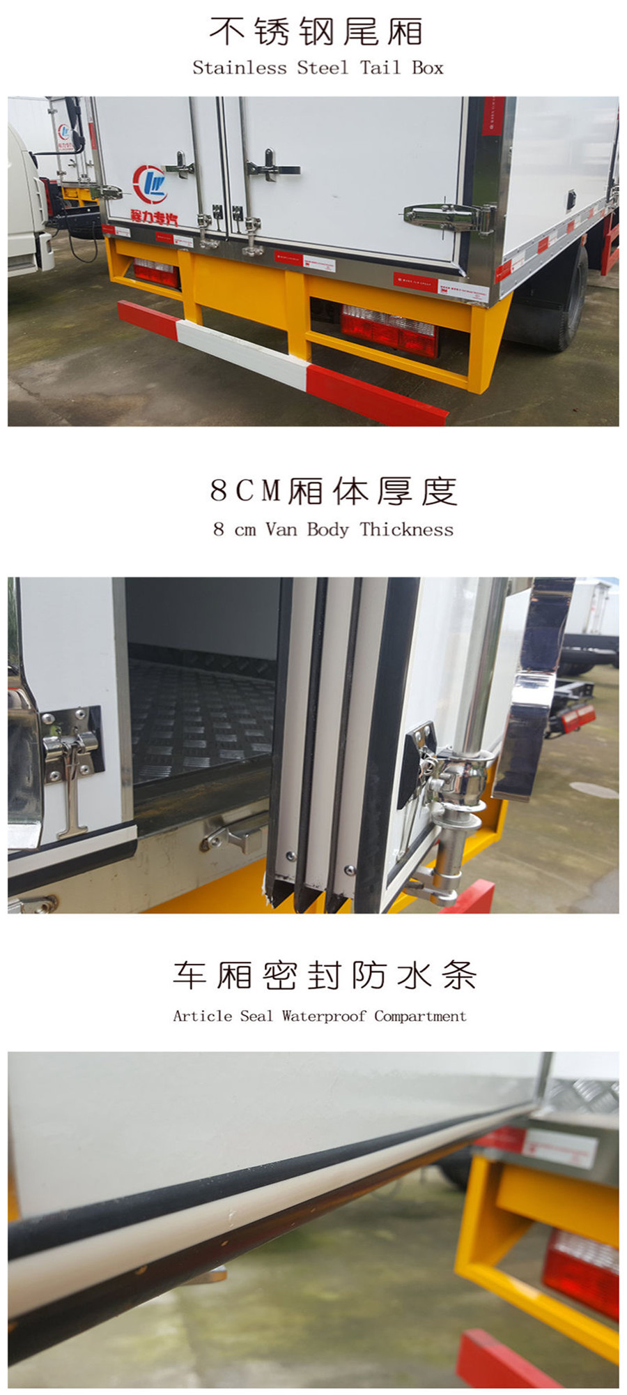 七 廂體配置:我公司冷藏車廂體采用液壓吸附一體成型生產(chǎn)線制造,保溫性能達(dá)到國家A級標(biāo)準(zhǔn)。廂體內(nèi)面料采用最新款納米玻璃鋼(不吸光、隔熱性好、硬度強(qiáng)、抗氧化),保溫材料為8cm高密度聚氨酯保溫層,全密封樹脂膠粘接。廂體框架為防銹處理槽鋼支撐,廂體四周采用鋁合金型材包邊,不銹鋼包角。廂體內(nèi)部加裝LED夜間照明燈,四角加裝LED式寬度。配后雙開門(不銹鋼包邊、不銹鋼鎖件合頁),(側(cè)門選裝)尾部加裝防撞膠塊,采用三元乙丙橡膠密封條,3M反光膠板!