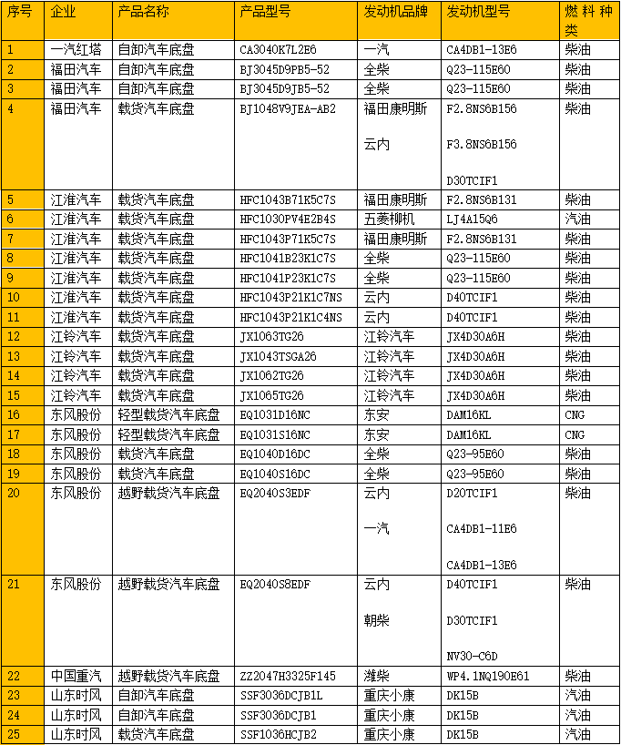 從具體車型來(lái)看,這52款車主要分為4大類:自卸汽車底盤、載貨汽車底盤、輕型載貨汽車底盤和越野載貨汽車底盤。詳細(xì)車型信息請(qǐng)見(jiàn)下表。