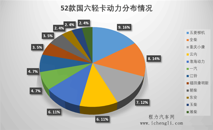 從動(dòng)力來(lái)看,這52款國(guó)六輕卡所搭載的動(dòng)力產(chǎn)品覆蓋濰柴、玉柴、福田康明斯、云內(nèi)、江鈴、朝柴、全柴、東安、重慶小康、一汽解放、五菱柳機(jī)、淮海動(dòng)力等12個(gè)品牌。其中,數(shù)量最多的是五菱柳機(jī),共搭載在9款產(chǎn)品上;全柴次之,有8款輕卡產(chǎn)品采用了全柴國(guó)六發(fā)動(dòng)機(jī)。