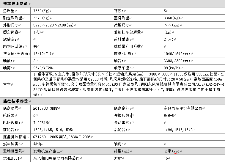 新款5噸灑水車采用東風(fēng)多利卡底盤,白色可前翻駕駛室,朝柴102馬力國五發(fā)動機(jī),5檔變速箱,軸距3308mm,1.8噸前橋,3.5噸后橋,7.00R16原廠鋼絲胎,原廠abs,帶方向助力,離合助力器,氣剎制動。