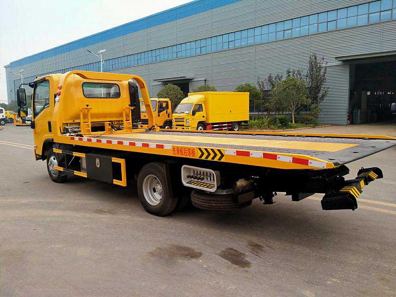 慶鈴五十鈴KV100_5.2米一拖二高速救援清障車上裝配置:配喊話器一套。四條新式捆綁帶。平板結(jié)構(gòu)專業(yè)化,模塊化生產(chǎn),各個(gè)總成精密制造,互換性強(qiáng)。4噸上裝新款藍(lán)牌,雙側(cè)聯(lián)動(dòng)操作裝置,半落地式托板。傾斜油缸布置在大梁內(nèi)側(cè),支撐同一橫梁上,載荷分布均勻,大大提高了整車的選取壽命。帶后托臂。