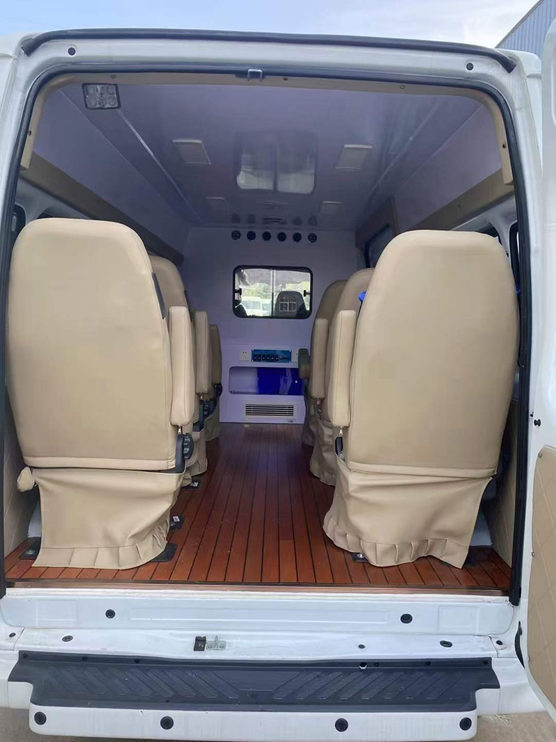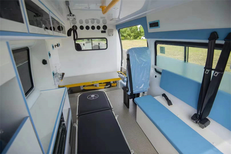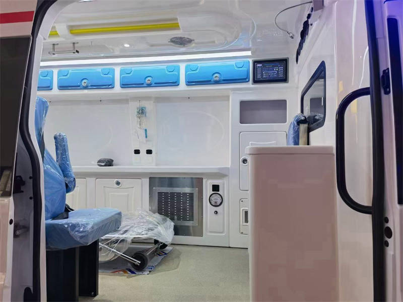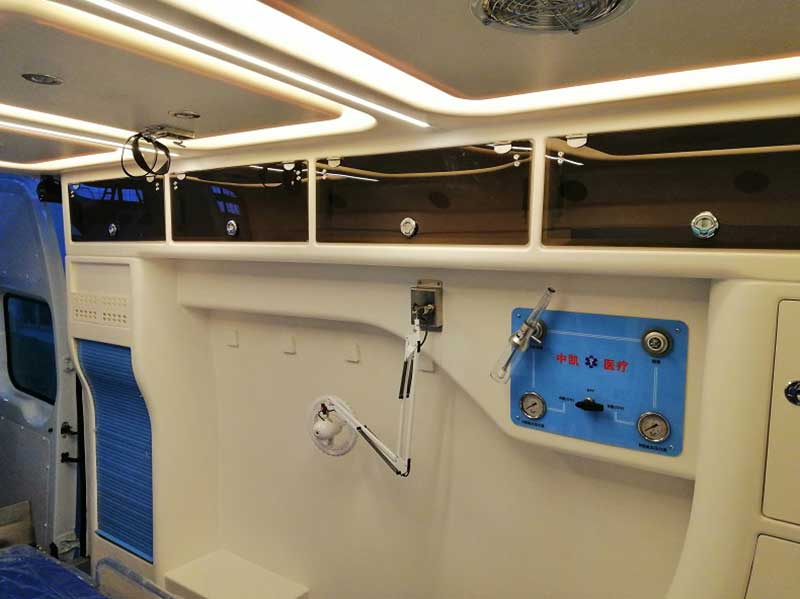 新時代全順V348短軸救護(hù)車,艙內(nèi)配有定向排風(fēng)系統(tǒng)。后門上車照明燈,夜間工作也很利于。鏟式擔(dān)架安裝在后門左內(nèi)側(cè)(或在柜式床內(nèi)存放)。醫(yī)療艙左側(cè)藥品、器械儲物柜。兩側(cè)白色照明燈。救護(hù)車整體都配備的有電路控制系統(tǒng)及保護(hù)。前部設(shè)置的有小醫(yī)療柜。