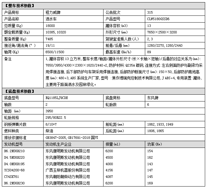底盤配置:采用東風(fēng)D9系列新款駕駛室,3950mm軸距,搭載國六(國Ⅵ)玉柴200馬力柴油發(fā)動(dòng)機(jī)/康明斯210匹馬力柴油發(fā)動(dòng)機(jī),6檔變速箱,9T后橋,295真空胎,方向助力、斷氣剎、電動(dòng)窗、中控鎖、ABS,原裝空調(diào),GB7258新規(guī)。