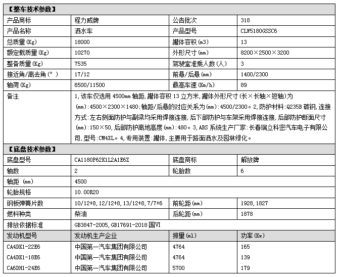 底盤配置:采用一汽解放原裝專用底盤,一汽解放駕駛室,4500mm軸距,搭載國六(國Ⅵ)一汽大柴224馬力柴油發(fā)動機(jī),8檔變速箱,8T后橋,10.00R20鋼絲胎,方向助力、斷氣剎、電動玻璃、多功能方向盤、空調(diào),ABS,GB7258新規(guī)。