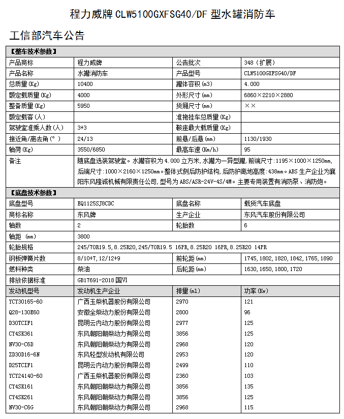 東風(fēng)大多利卡5噸水罐消防車,整車型號:CLW5100GXFSG40/DF型水罐消防車,采用東風(fēng)EQ1125SJ8CDC原裝底盤改裝而成水罐消防車。整車由消防員乘員室和車身兩大部分組成,乘員室為原裝雙排,可乘坐3+3人,該車為內(nèi)藏罐結(jié)構(gòu),車身兩側(cè)為器材箱,中部為水罐,后部為泵房。載液罐體為優(yōu)質(zhì)碳鋼,與底盤采用彈性連接,載水4000kg,裝備CB10/30型低壓消防泵,額定流量30L/S,車頂安裝PS30型車用消防炮。該車輛結(jié)構(gòu)緊湊,配置完備,機(jī)動性強(qiáng),能夠及時(shí)應(yīng)對企業(yè),社區(qū)或重點(diǎn)消防單位的火情,可以第一時(shí)間形成小型戰(zhàn)斗力進(jìn)行初期火災(zāi)的撲救和人員疏散撤離;可廣泛應(yīng)用于消防救援站,政府專職消防隊(duì),企業(yè)專職消防隊(duì)等。可選上牌種類(民用/軍用)手續(xù)。