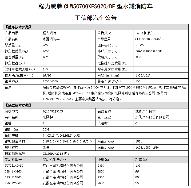 東風(fēng)多利卡2噸水罐消防車,整車型號(hào):CLW5070GXFSG20/DF型水罐消防車,采用東風(fēng)EQ1075DJ3CDF底盤改裝而成水罐消防車。整車由消防員乘員室和車身兩大部分組成,乘員室為原裝雙排,可乘坐2+3人,該車為內(nèi)藏罐結(jié)構(gòu),車身兩側(cè)為器材箱,中部為水罐,后部為泵房。載液罐體為優(yōu)質(zhì)碳鋼,與底盤采用彈性連接,載水2000kg,裝備CB10/20型低壓消防泵,額定流量20L/S,車頂安裝PS20型車用消防炮。該車輛結(jié)構(gòu)緊湊,配置完備,機(jī)動(dòng)性強(qiáng),能夠及時(shí)應(yīng)對(duì)企業(yè),社區(qū)或重點(diǎn)消防單位的火情,可以第一時(shí)間形成小型戰(zhàn)斗力進(jìn)行初期火災(zāi)的撲救和人員疏散撤離;可廣泛應(yīng)用于消防救援站,政府專職消防隊(duì),企業(yè)專職消防隊(duì)等。可選上牌種類(民用/軍用)手續(xù)。