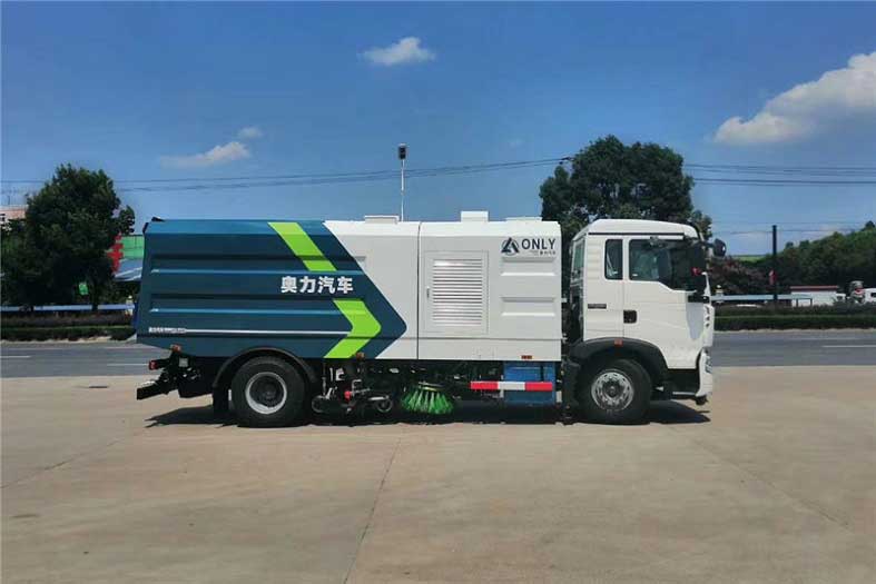 16方洗掃車_重汽豪沃T5G洗掃車功能特點(diǎn):左、右高壓側(cè)噴桿與吸嘴“V”型布置,液壓操作收放,并可調(diào)整“V”形角度及高壓水噴嘴角度,水流沖擊力大,能高效匯集污水,并具噴桿有防撞和自動(dòng)復(fù)位功能。能夠隨垃圾箱體舉升的動(dòng)力倉罩可使動(dòng)力系統(tǒng)的維修保養(yǎng)極為便利。洗掃車作業(yè)時(shí)先用邊刷將道牙處的垃圾向中間集中,再用高壓水進(jìn)行清洗,然后由吸口將污水及垃圾吸到污水箱中。手持不銹鋼噴槍配快速接頭,能簡(jiǎn)單地與沖洗卷盤連接或脫開。