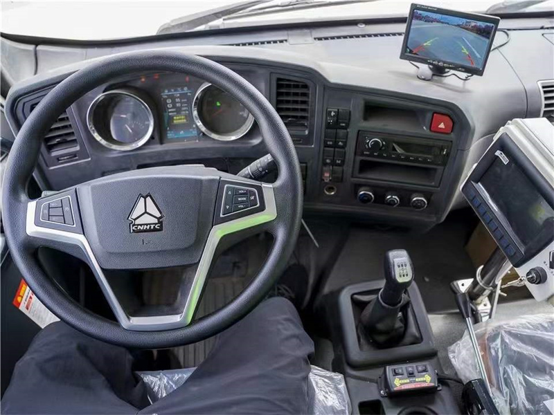 16方洗掃車_重汽豪沃G5X洗掃車底盤配置:200L鋁合金油箱。275/80R22.5輪胎。4.5噸的前橋,10噸的后橋。斷氣剎,ABS,中控鎖,多功能方向盤,方向助力。重汽豪沃排半駕駛室。