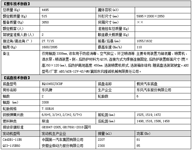 上裝配置:罐體容積約:5立方米,方形罐體制作,罐體鋼板采用Q235碳鋼鋼材,前沖后灑、側噴、平臺高炮、自流閥及消防接頭各1個、水管2根、標配億豐泵或金龍泵,后平臺加裝30米、40米霧炮機組;其他標配。