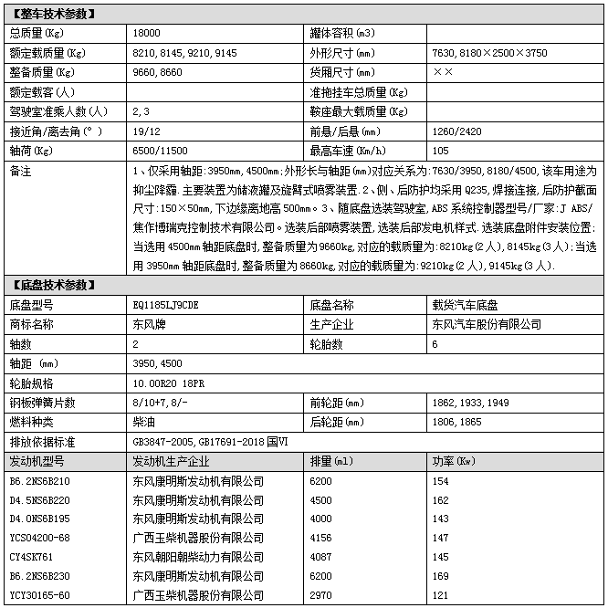 配置二:東風(fēng)D9多利卡系列駕駛室,4500mm軸距,康明斯230馬力(B6.2NS6B230)發(fā)動(dòng)機(jī),法士特8檔變速箱,10.00R20鋼絲胎,空調(diào)電動(dòng)窗,ABS,斷氣剎,方向助力;